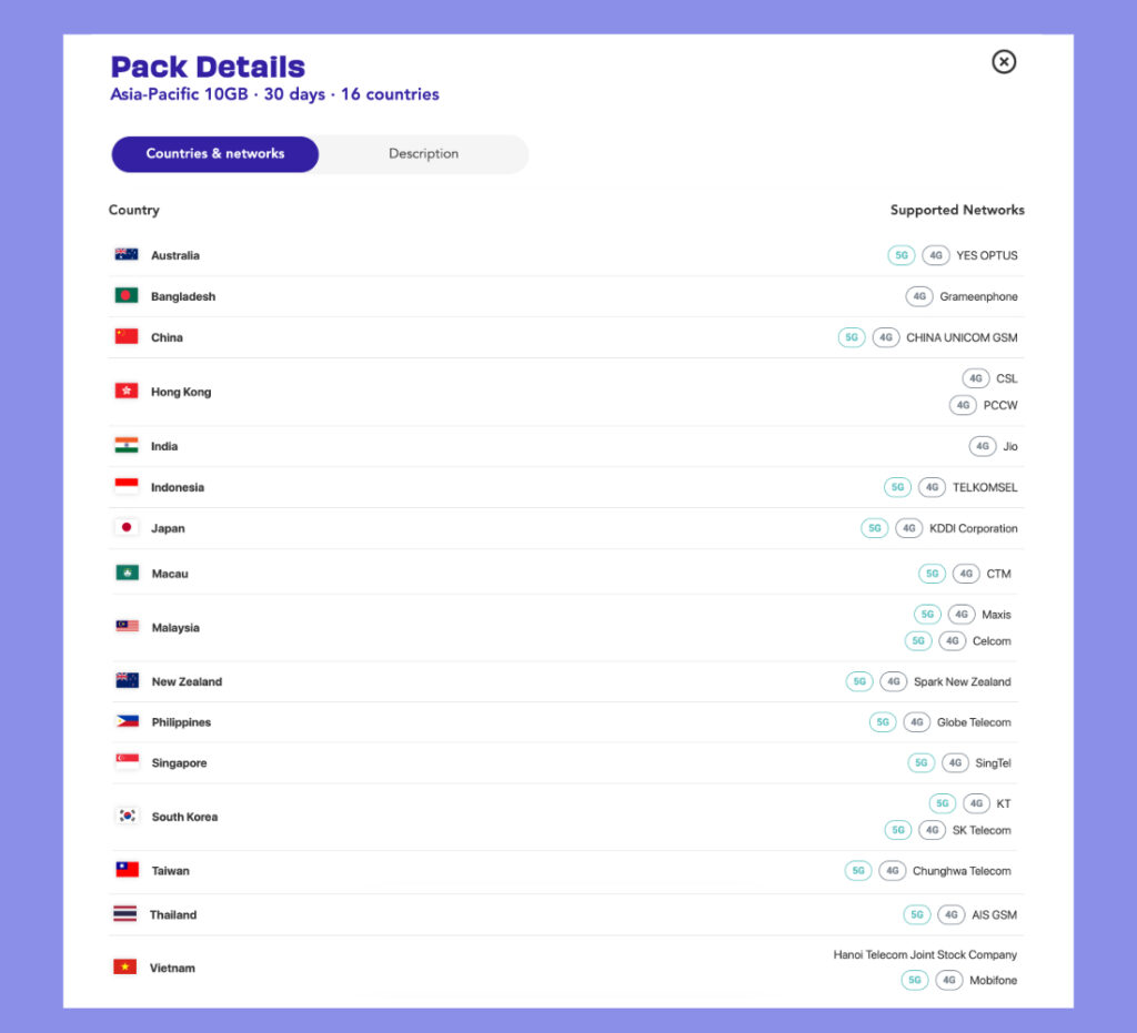 Some eSIMs cover more than just one country, with either regional or global eSIM plans. For example, Jetpac has a package for Asia-Pacific that covers 16 countries from Australia to Vietnam. And the one for Europe encompasses 30 countries from Austria to the UK.