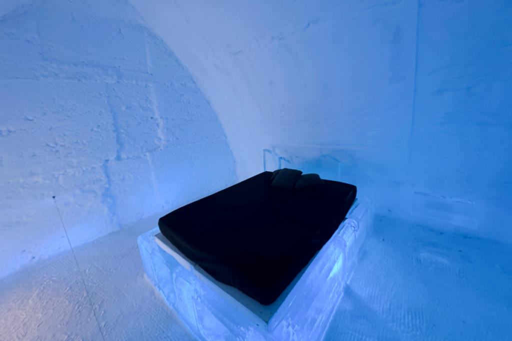 They provide everything you need — primarily a sleeping bag rated to -18° C — and the rooms themselves are a consistent -3° to -5°. The ice block has a pretty comfy mattress on it, so you don’t need to worry about packing any bedding or camping gear.